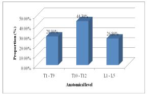 Majority (44.3%) of study participants had lower thoracic (T10-T12) level of injury followed by thoracolumbar junction (T11-L1) by (41.2%). Similar findings were reported by [5,8]. This is explained well by the relative weakness of the junction as it is the most flexible part of the spine. Different from other studies, the second leading part of vertebrae injured was the upper thoracic spine (28.8%) with almost equal proportional with Lumber injuries L1-L5 in which most of the studies were the second leading fracture patterns among the study participant; a study done in the USA reported to have 37.6% of the study population contrary from this study however also the mechanism of injury was different8