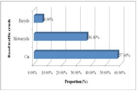 A large proportion of the study participants 56 (57.7%) were involved in falls, followed by road traffic crush 33 (34.0%). Most of those who were involved in a road traffic crashes, were due to car crush 19 (57.6%). This is shown in Figure 3 and Figure 4.